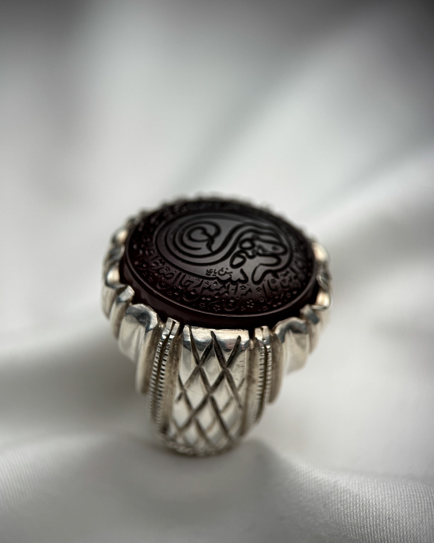 Elevate your style and spiritual well-being with the Ring. This striking Ring features a bold, polished Normal Haqeeqe & Sulemani Haqeeq stone set in a meticulously crafted 92.5 sterling silver band. The intricate design and oxidized finish give it a vintage, yet contemporary appeal, perfect for the modern man. The Normal Haqeeqe & Sulemani Haqeeq stone is known for its calming properties, enhancing emotional balance and mental clarity. The adjustable fit ensures comfort for all Finger sizes, making it a versatile addition to any wardrobe.